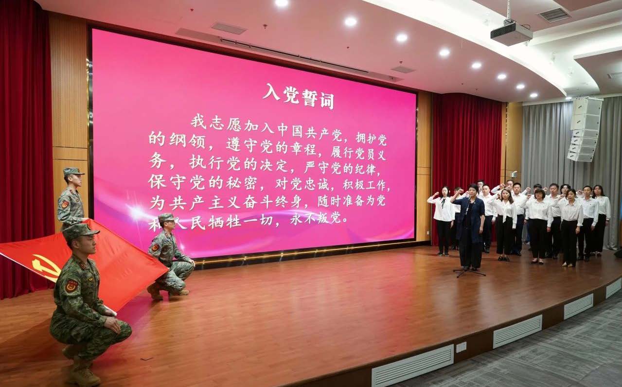 活动中,镇党委主要领导领誓,新发展党员庄严宣誓,会场全体党员重温入党誓词。