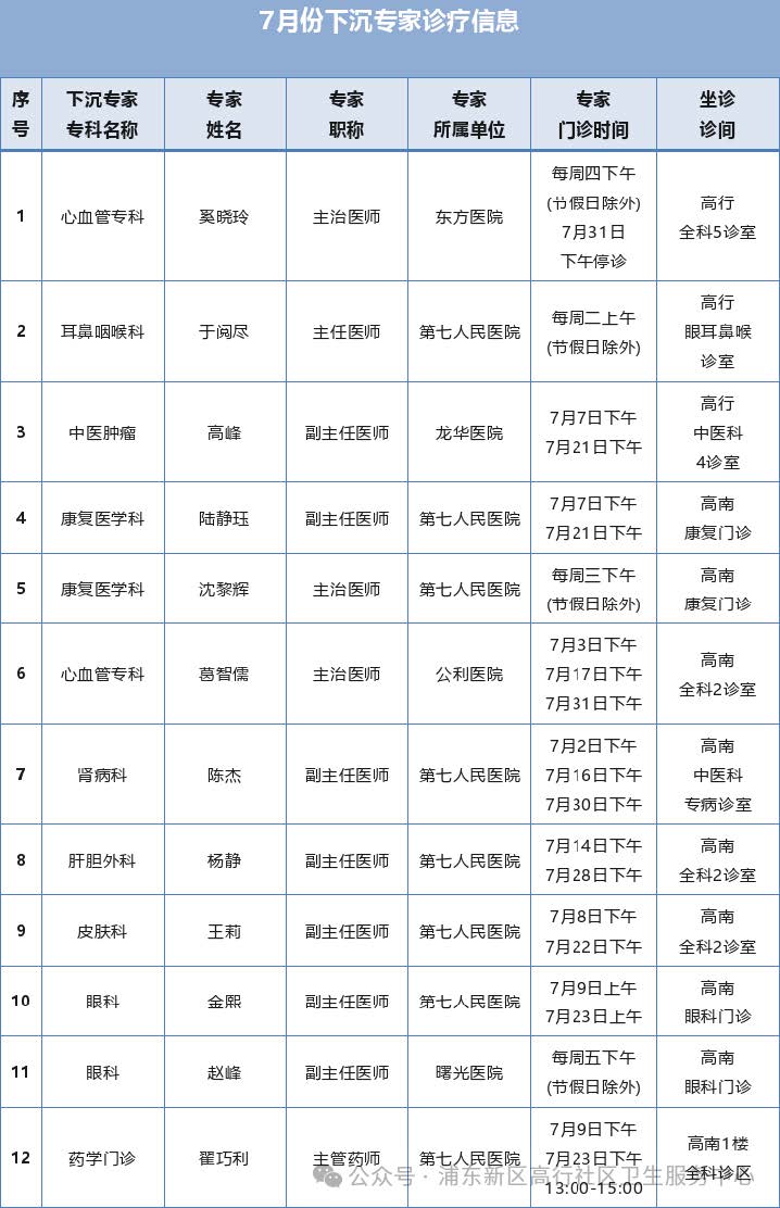 高行社区卫生服务中心7月份下沉专家诊疗信息